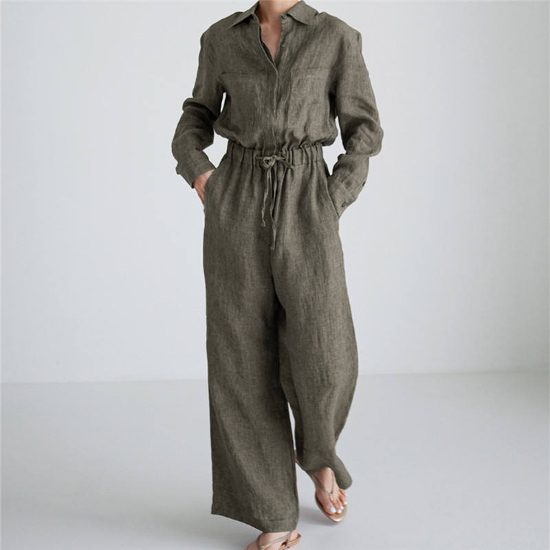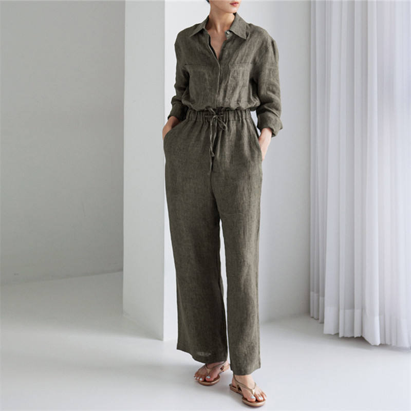 Mode féminine motif solide combinaison ample grande taille jambe large élégant Style Preppy costume en lin décontracté été Style décontracté