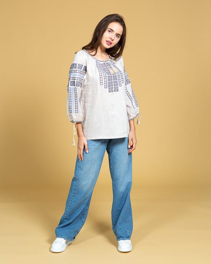 Women's Floral Embroidery Casual Fashion Long Sleeve Blouse Simple Weave Crew Neck Top with Tassel for Parties-White Color