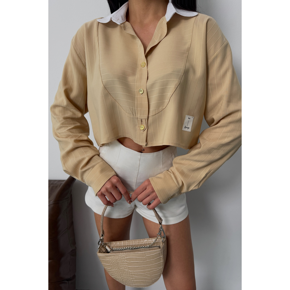 Women's Formal Crop Top with Beige Plaid Pattern Embroidered Logo Lace Decoration Asymmetrical White Collar-Size XL