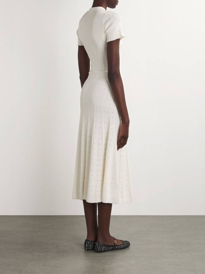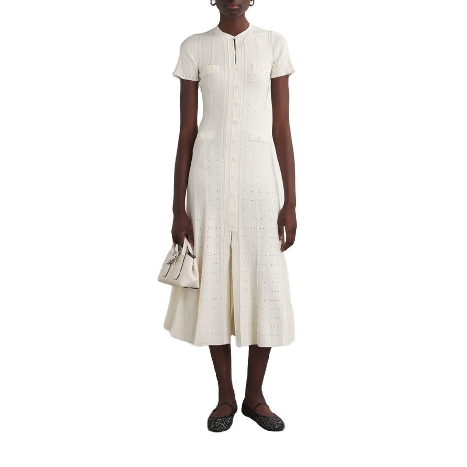 Robe trapèze en tricot côtelé à volants, à manches courtes, respirante, unie, style français doux, boutonnée sur le devant, fente, taille cintrée