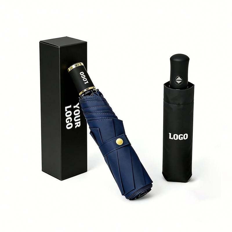 Parapluie pliant automatique trois volets noir en caoutchouc pour femme, double usage soleil et pluie, avec logo personnalisé, design classique, vente en gros