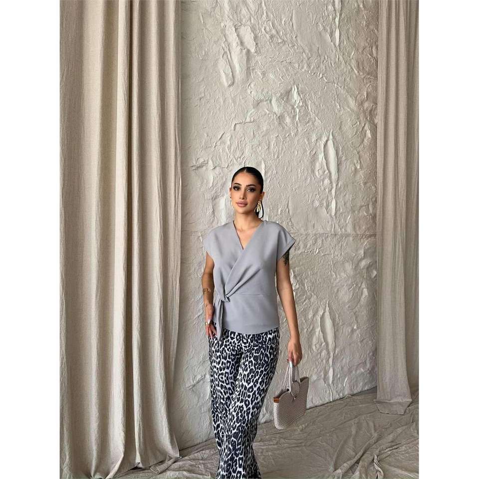 Chemise sans manches grise pour femme avec détail de nœud latéral, logo brodé, col à volants, formelle pour le bureau, fête - Taille XL, coupe ample