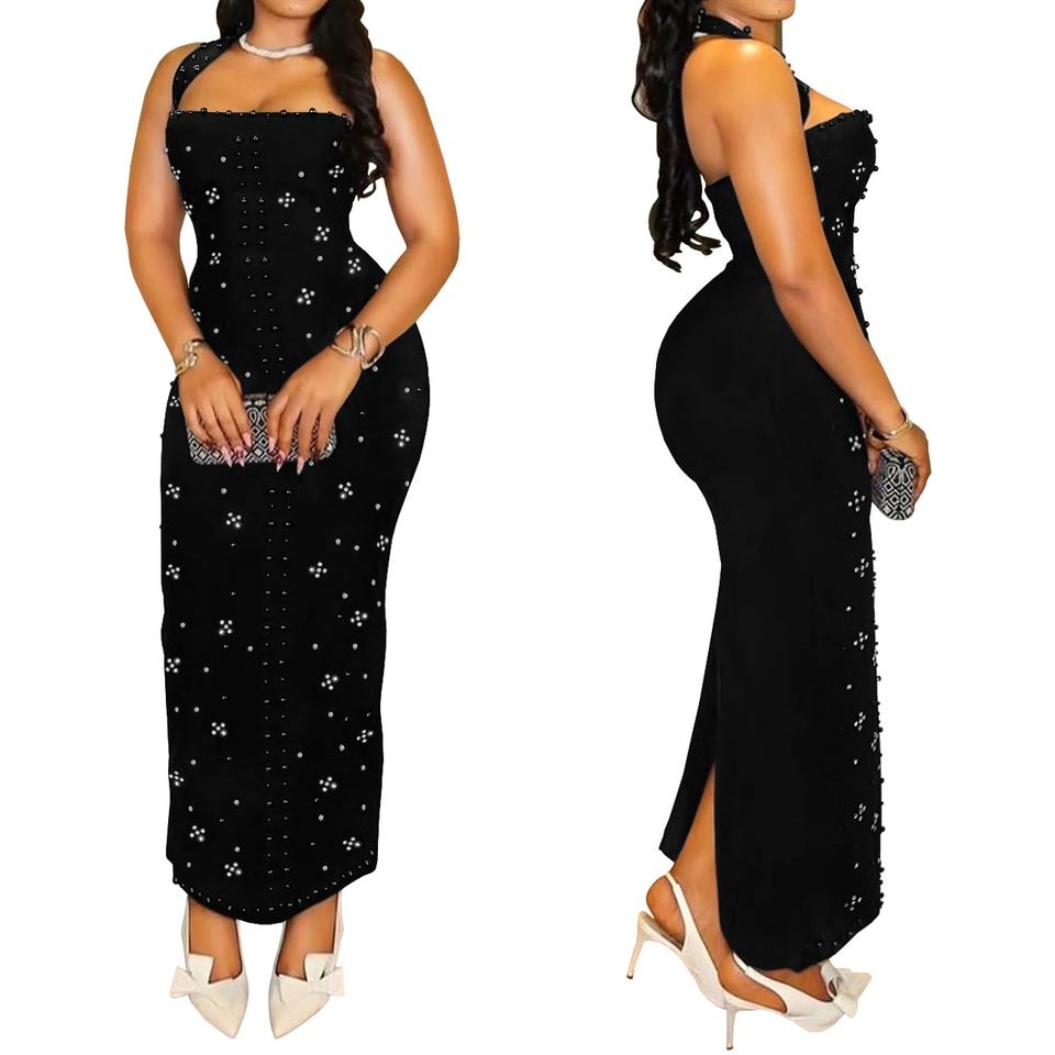 Robes ajustées à col halter pour femmes, ornées de strass et de perles, tendance