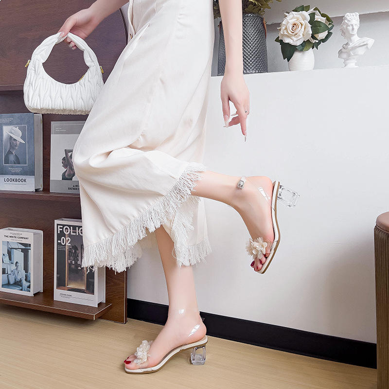 Sandales à talons pour femmes, bout ouvert, talon carré, motif floral transparent en cristal, élégantes, tendance mode été, abricot