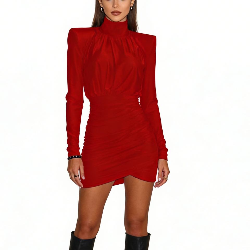 Women's High Neck Ruched Bodycon Mini Dress Long Sleeve Wrap Hem Party Dresses Fashion