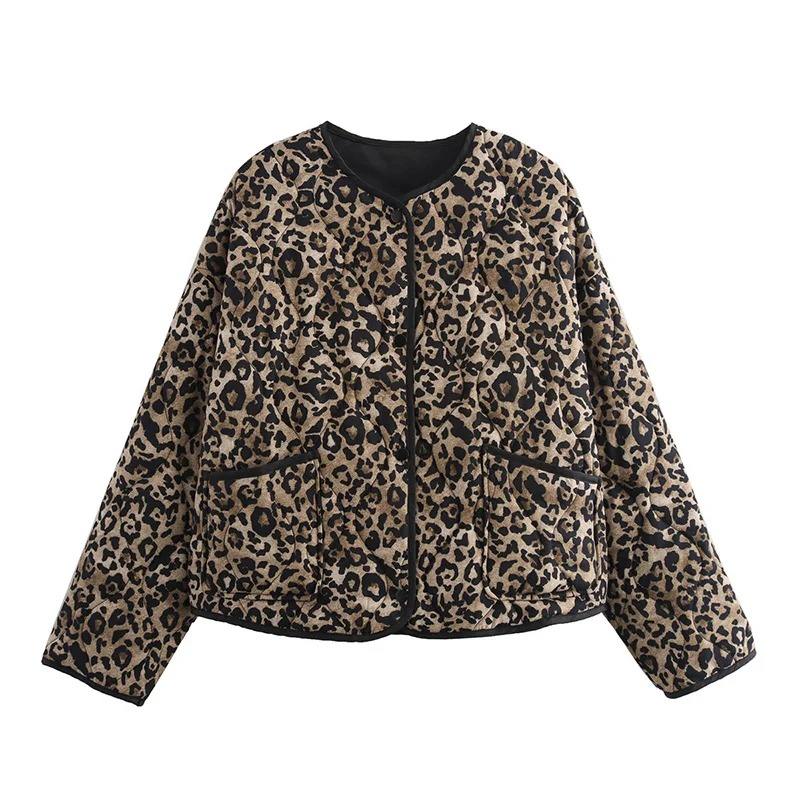 Women's High Street Vintage Long Sleeve Padded Jacket Female Leopard Print Quilted Outerwear Stand Winter Coat for Autumn Parkas