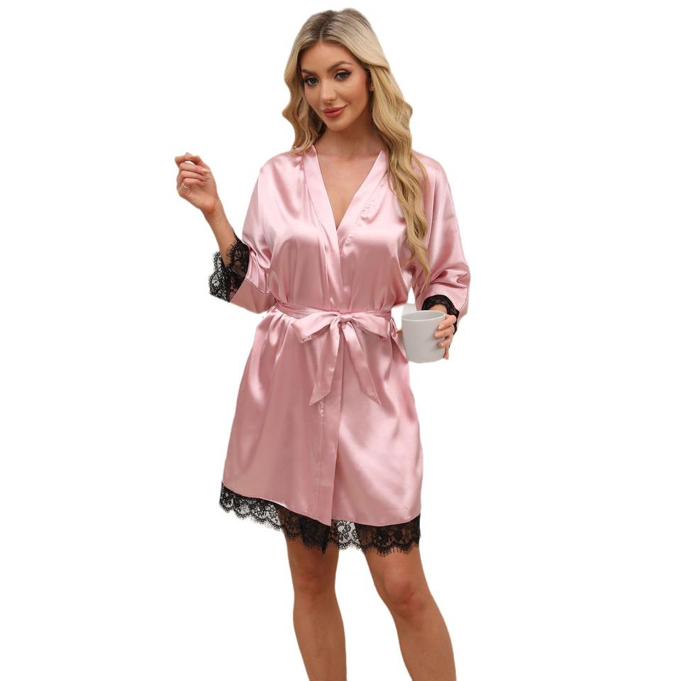 Women's Home Wear Nightgown Lace Stitching Satin Imitation Silk Bathrobe Pajamas Sleepwear