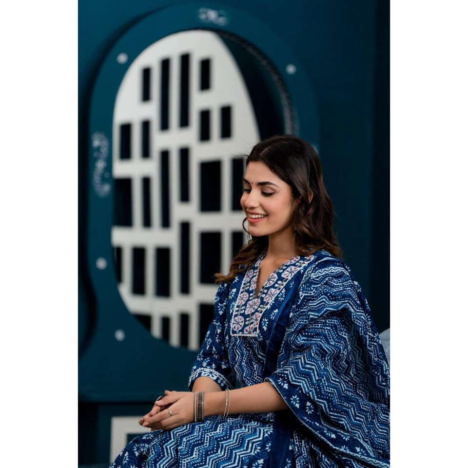 Women's Indigo Blue Anarkali Kurta with Trousers & Dupatta Ethnic Motifs Printed Indian Festival Wear Salwar Kameez for Girls