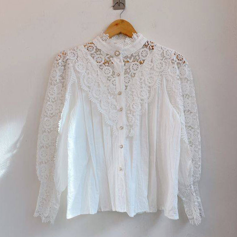 Chemises en dentelle pour femmes, couleur unie, manches longues, col montant français, bouton, fleurs creuses, patchwork, décontracté, fête, printemps, respirant