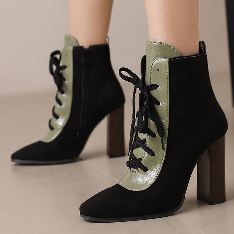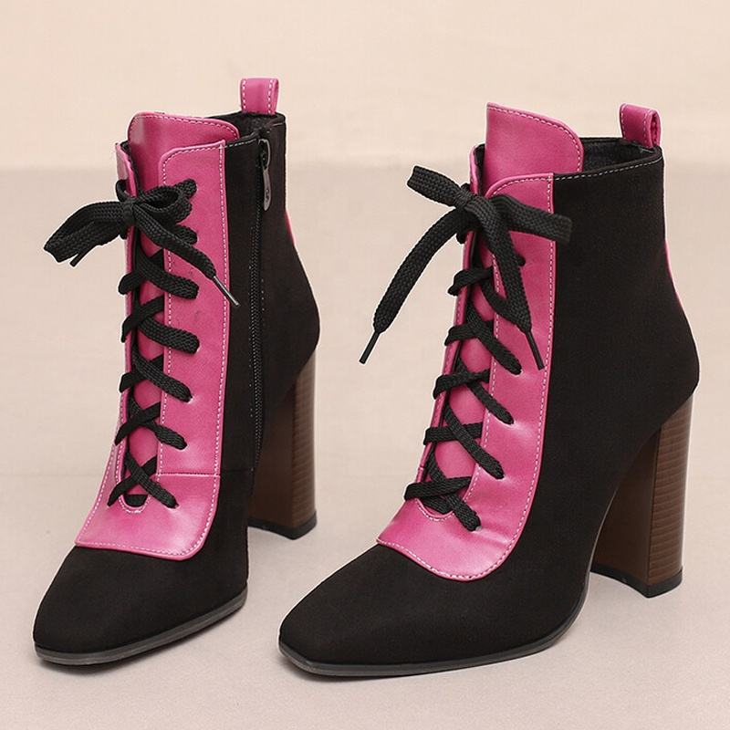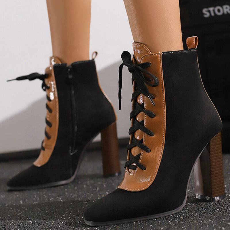 Bottines courtes pour femmes, grande taille 50, à lacets, motif bois, talons hauts épais, coupe large, patchwork