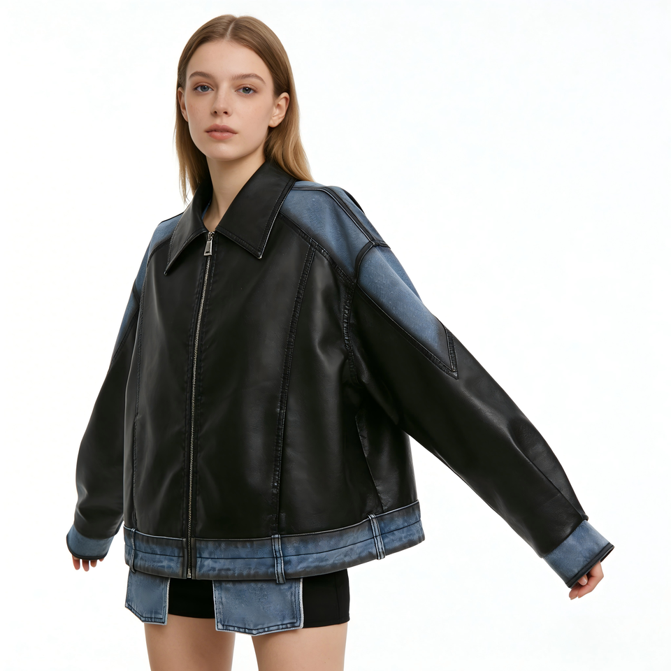 Veste en cuir et denim patchwork pour femme, noire, surdimensionnée, effet deux pièces, style motard, personnalisable
