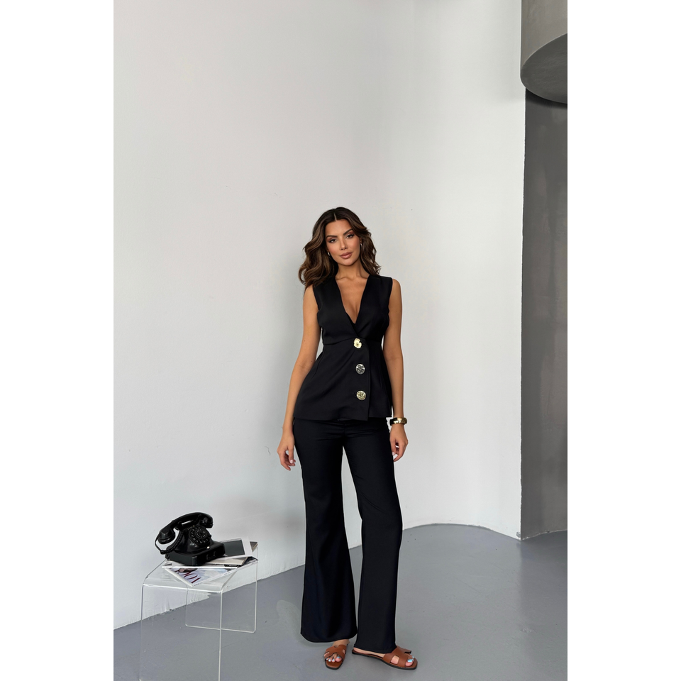 Ensemble gilet et pantalon en lin pour femme, boutons dorés, noir, coupe ajustée, hauts courts et longs, motif uni, pour l'hiver et l'automne