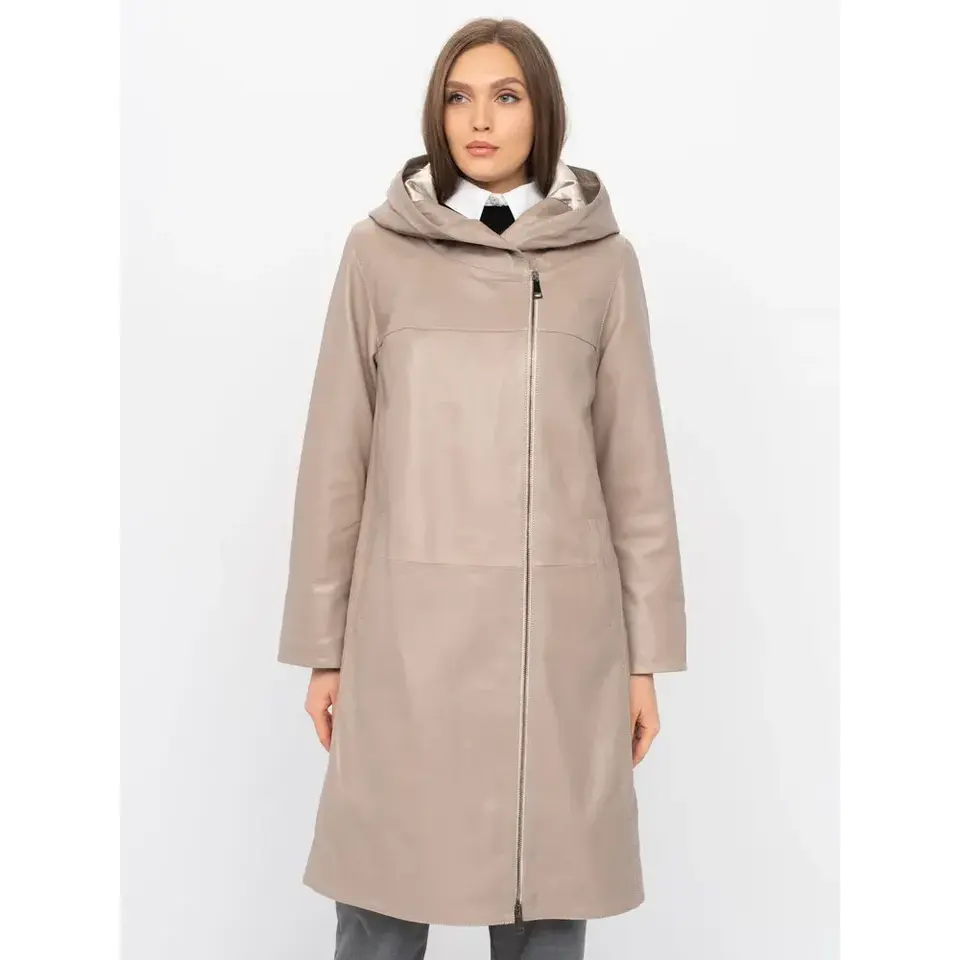 Women's Long Beige Lambskin Hooded Leather Coat Handcrafted Istanbul - Minimalist Style Clean Zip-Up Finish Customizable Size