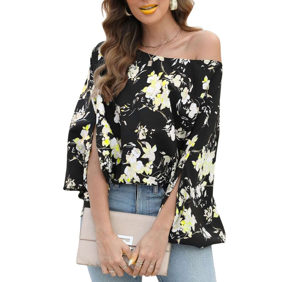 Women's Loose Chiffon Blouses with Embroidery Lace Decoration off the Shoulder Flowy Tops Batwing Sleeves Casual for Spring