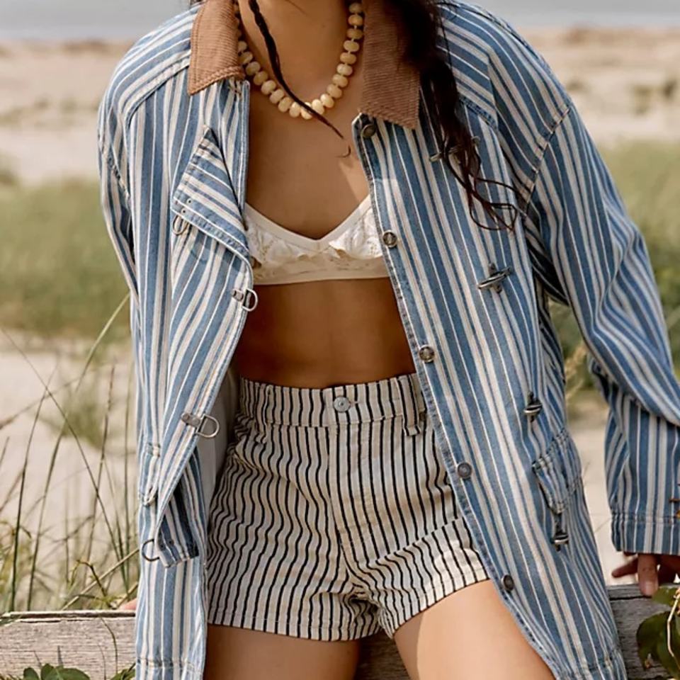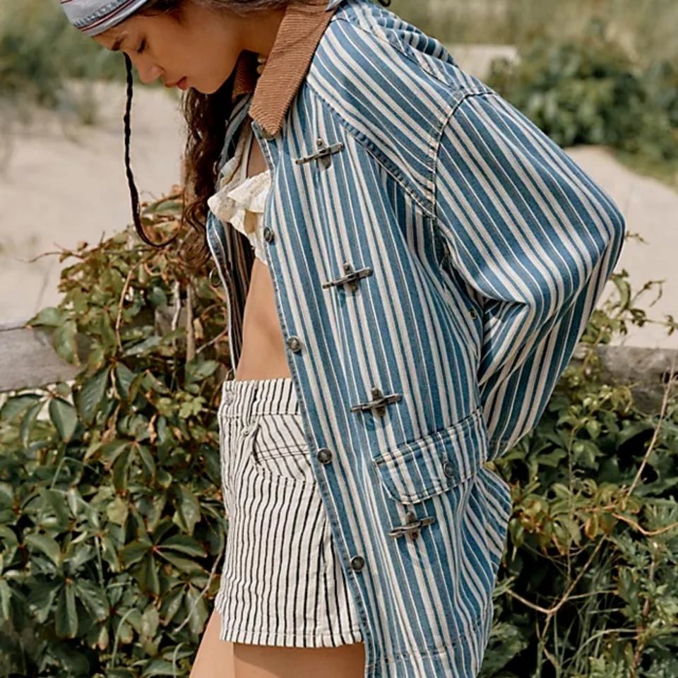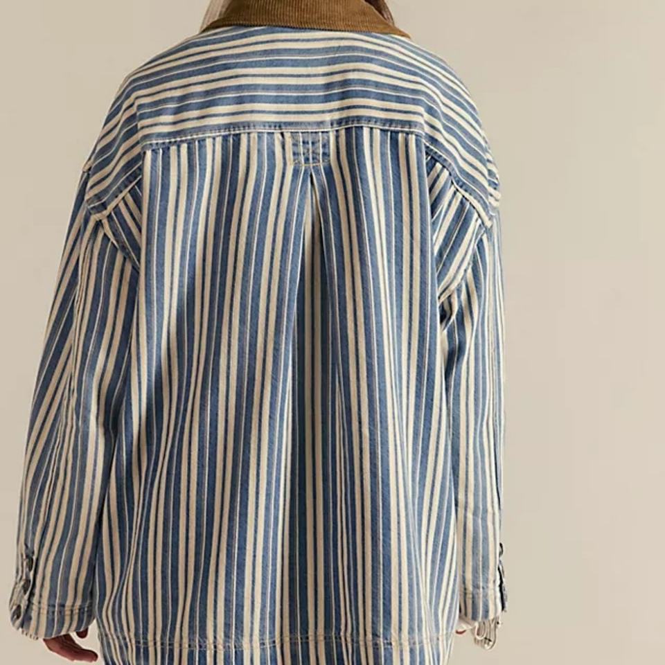 Veste rayée ample pour femme avec col en velours côtelé - Style bohème pour la vente en gros, manteau bleu et blanc tendance