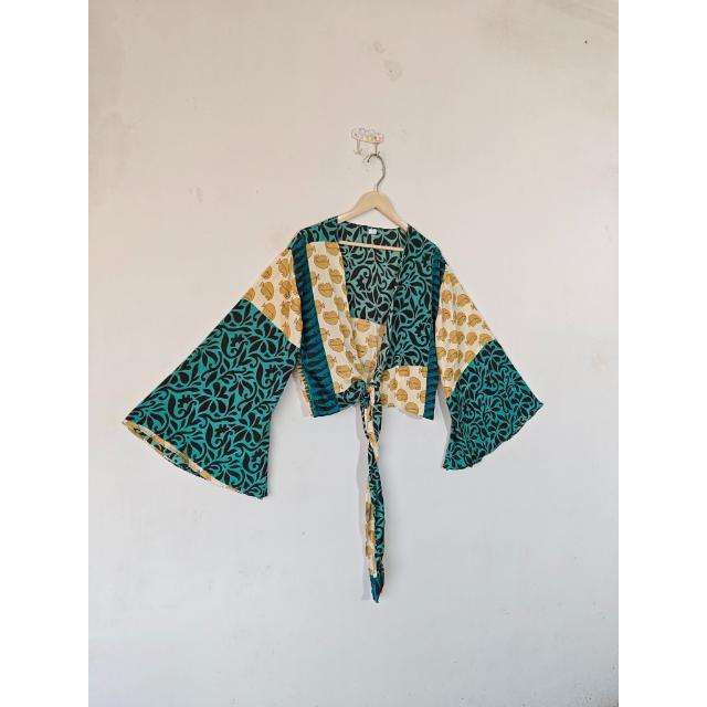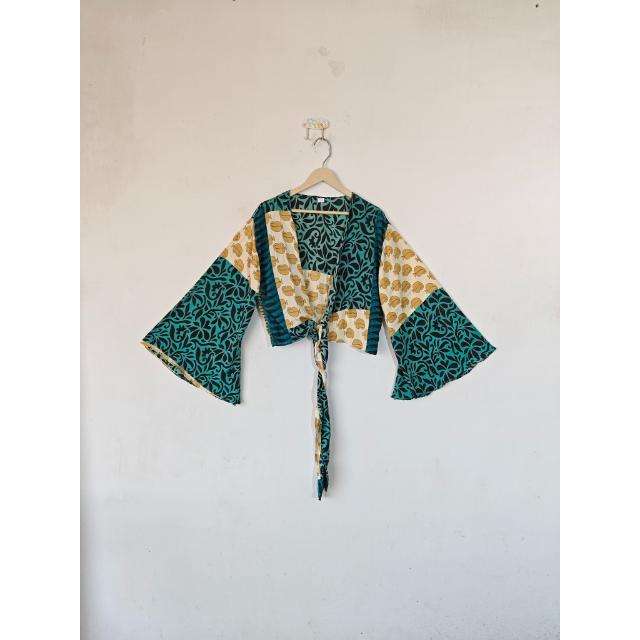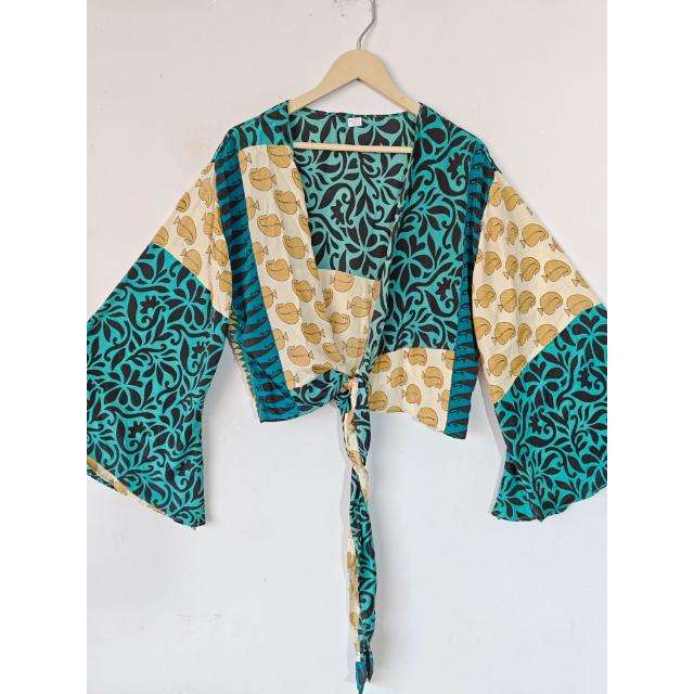 Women's Most Trending Eco-Friendly Crop Top Vintage Style Floral Dot Print Silk Wrap Summer Parties Casual Bell Sleeve Free Size