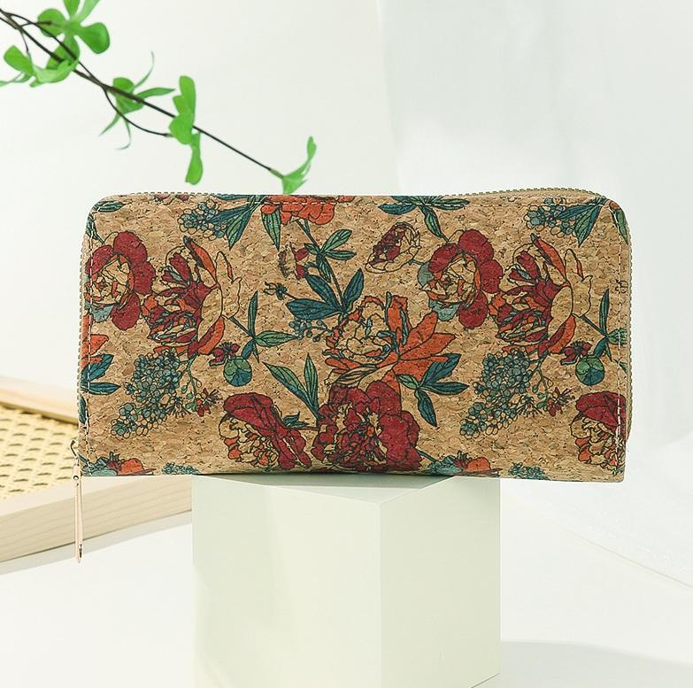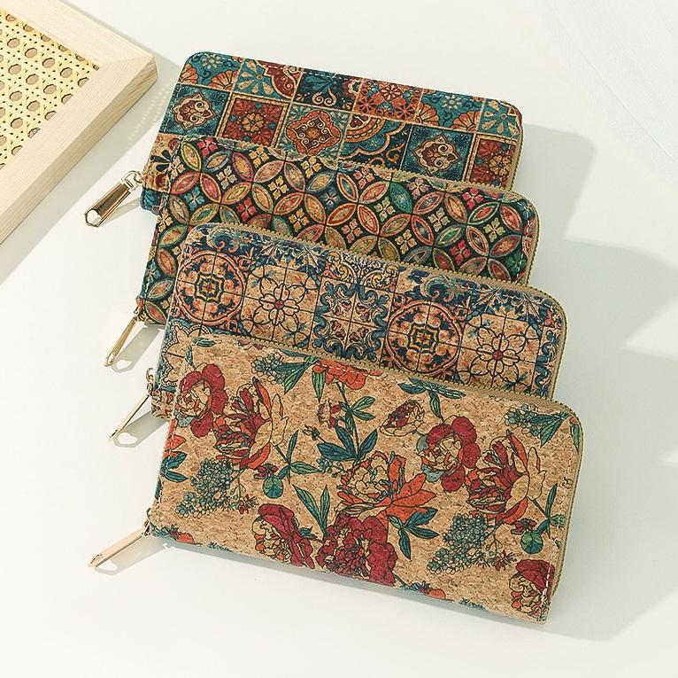 Portefeuille long multifonctionnel pour femme, style ethnique, avec fermeture éclair, rétro, portable, en liège, avec porte-cartes, RFID, pour téléphone, argent et pièces de monnaie