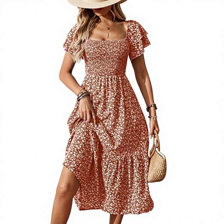 Robes décontractées mi-longues pour femmes, nouvelle collection printemps-été, couleur unie, imprimé floral, col carré, manches courtes bouffantes, avec ourlet à volants