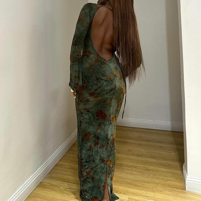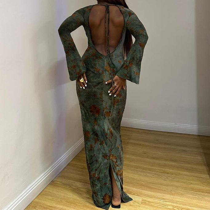 Robes longues ajustées pour femmes, nouveau style, col rond, manches longues, imprimées, dos nu, avec détail de nouage, tendance