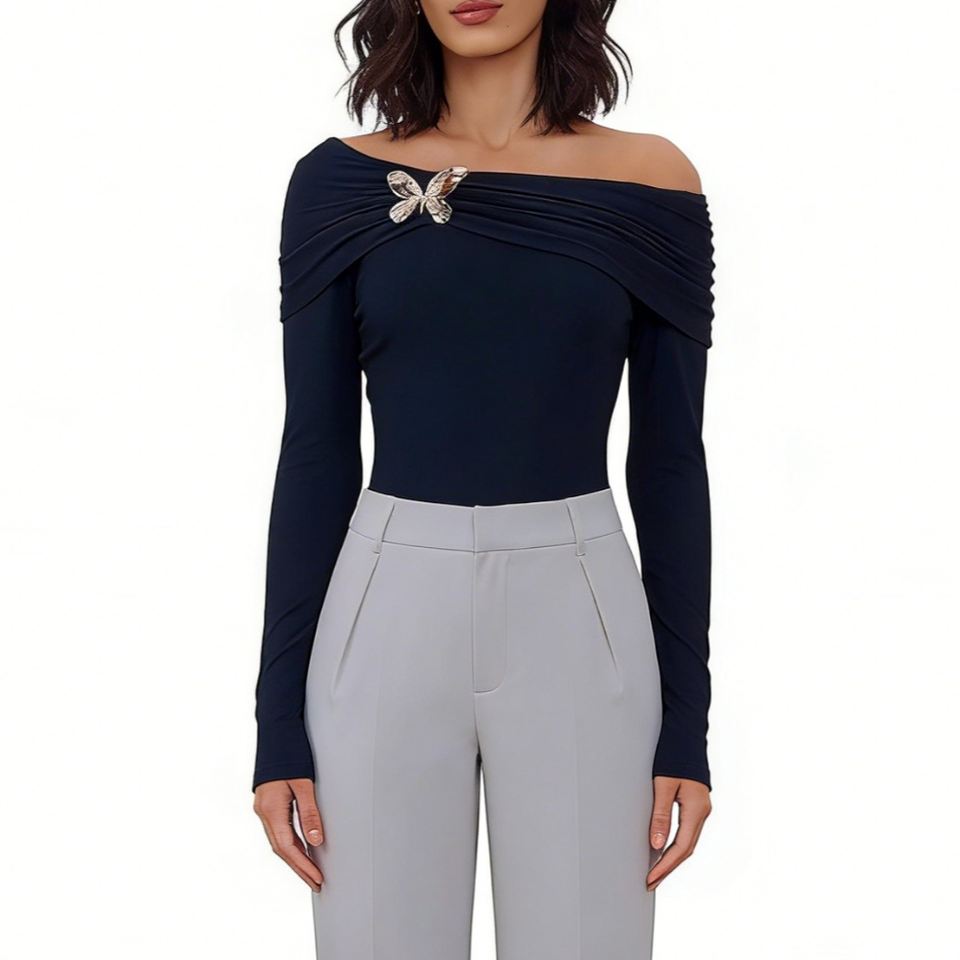 Body moulant à épaules dénudées pour femme - Haut ajusté à manches longues avec broche dorée - T-shirt tendance