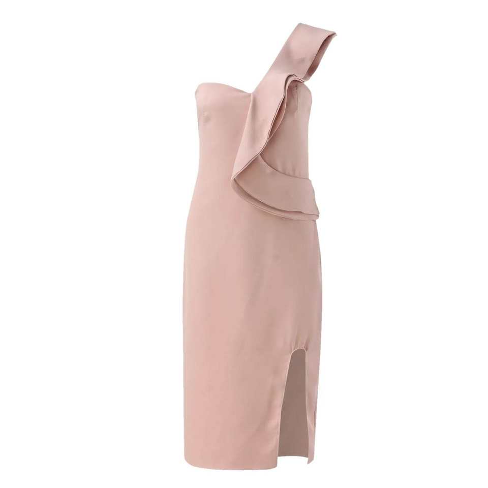 Women's One-Shoulder Strappy Cut Sleeveless Ruffled Trim Bodycon Side Split Wedding Guest Dresses A-Line Silhouette Vestidos