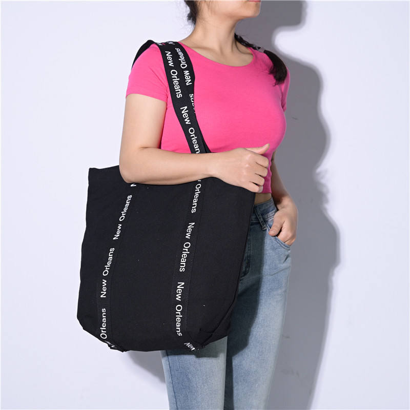 Women's Oversize Large Weekend Shopping Tote Bag Custom Logo Black Canvas Cotton Fashionable Letter Pattern