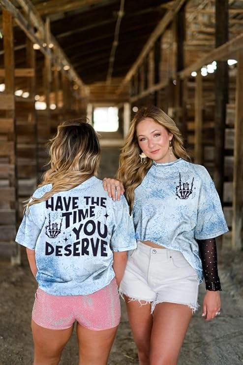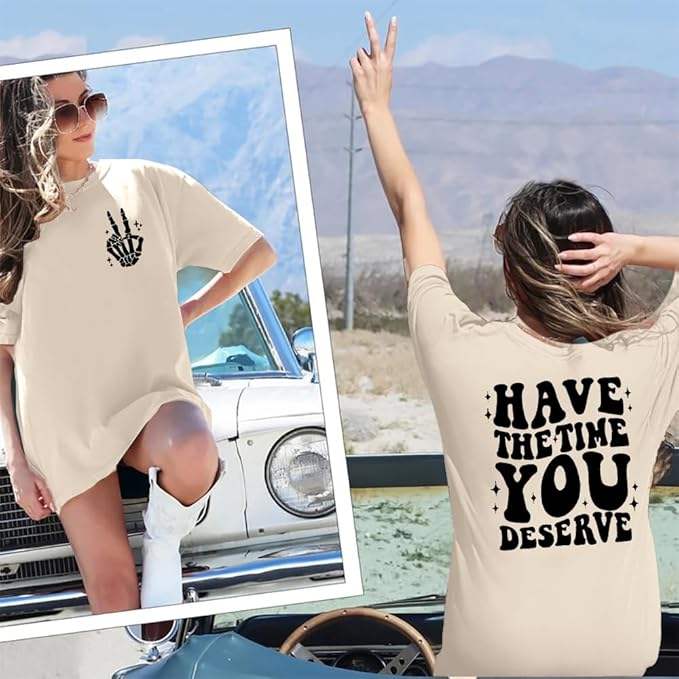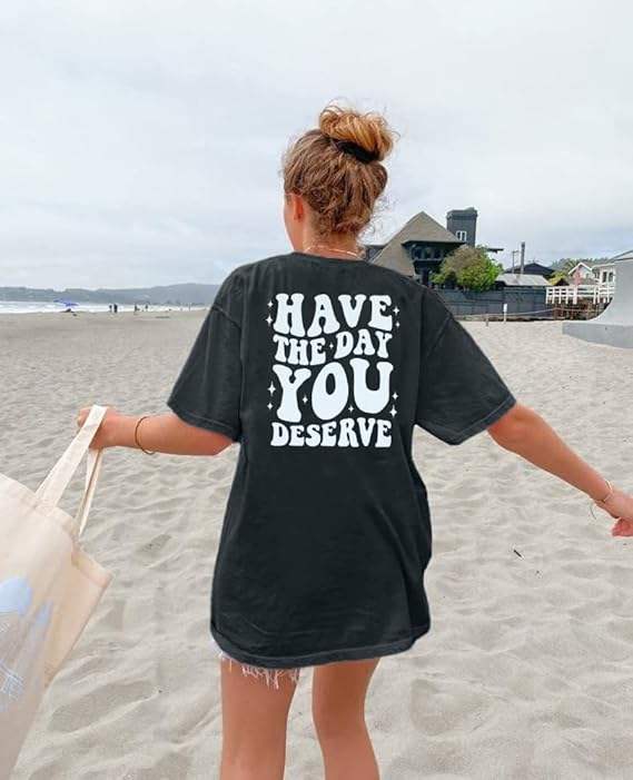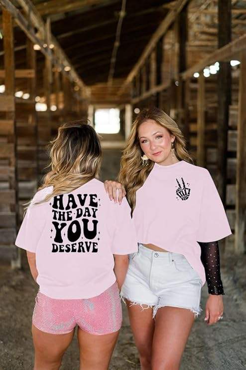 Women's Oversized Casual Graphic Tees Tops Funny Skeleton Design Summer Tshirts with Puff Printing Deserve Day Shirt