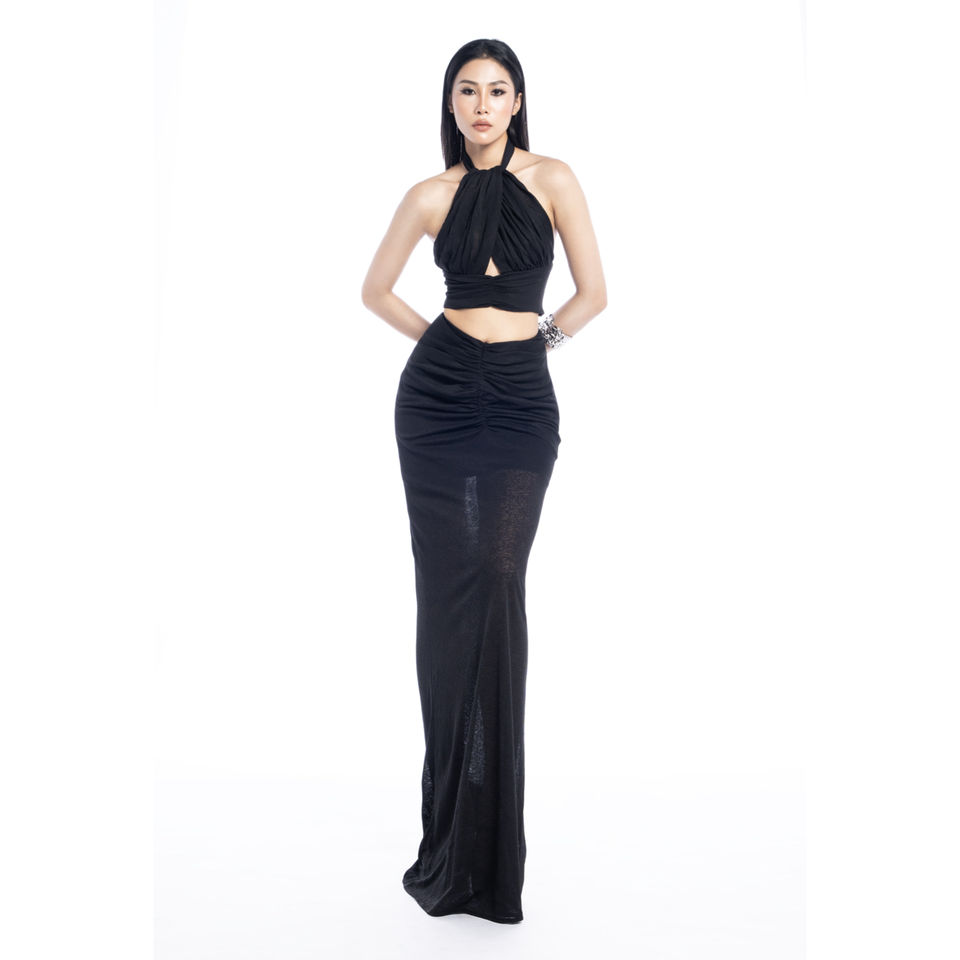 Technics:Gathered draping with body-contouring construction.