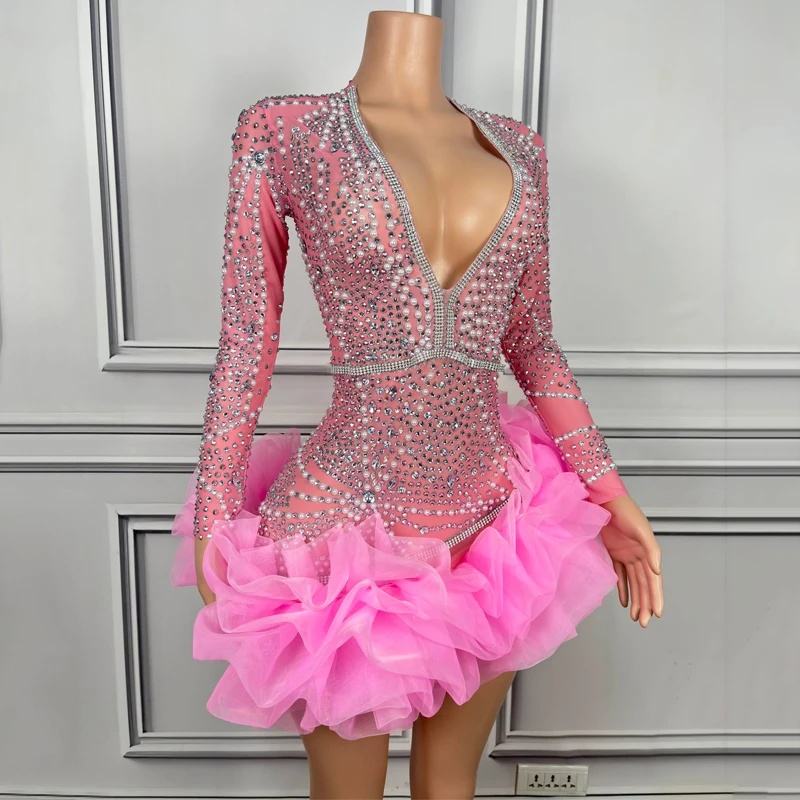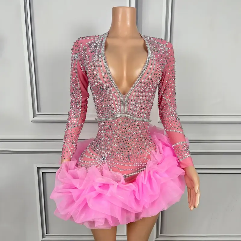 Robe de soirée longue en satin rose avec strass et perles pour femme, taille naturelle, respirante, pour l'été, XS8152