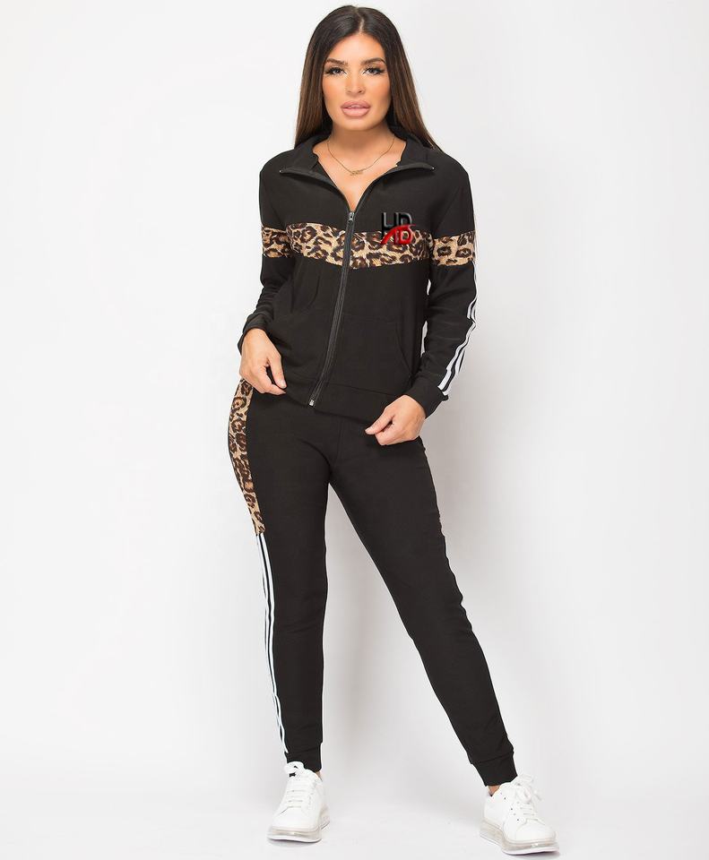 Femmes grande taille nouveau style imprimé léopard côté rayure survêtement ensemble longueur au genou avec fermeture éclair haut et bas poche latérale