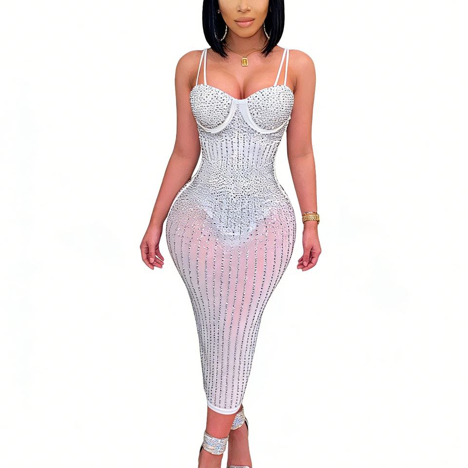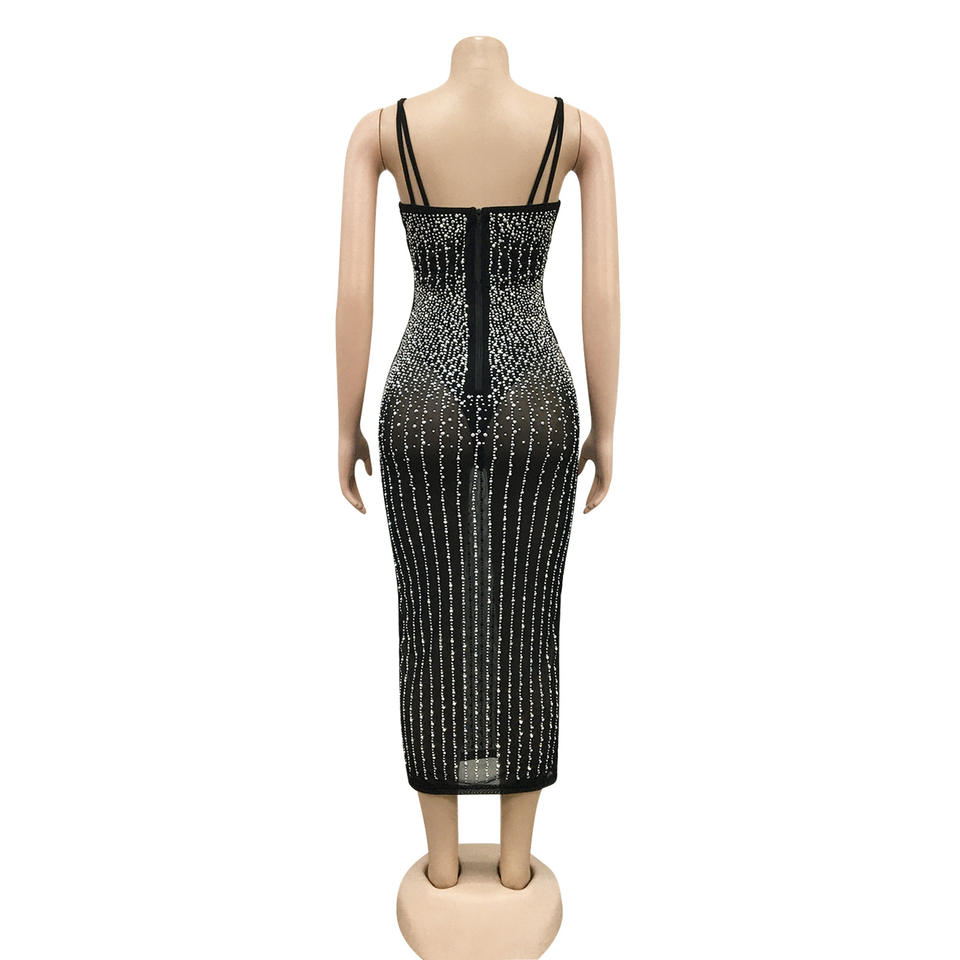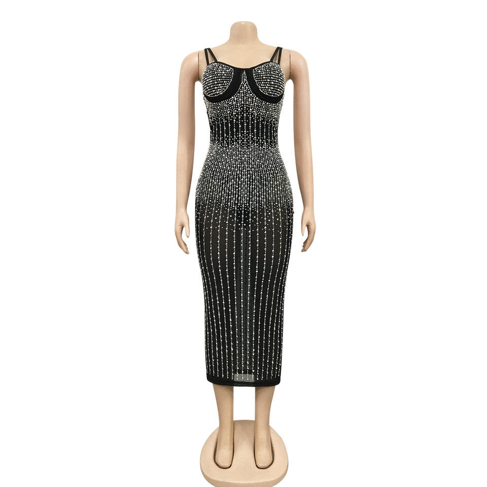 Robe midi en maille ornée de strass pour femme - Robe de soirée moulante à bretelles spaghetti Sehe Fashion