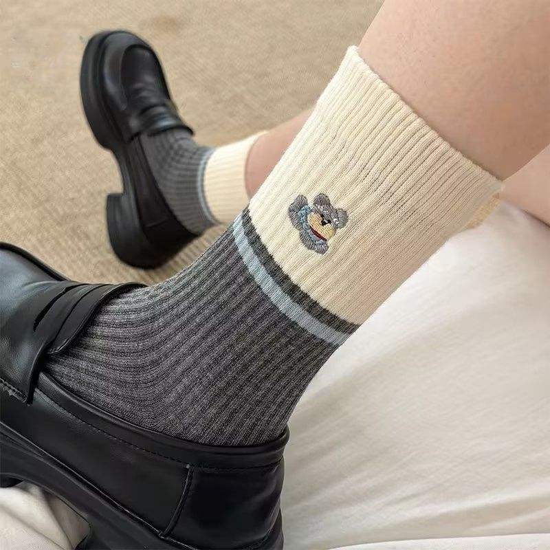Chaussettes côtelées pour femmes avec broderie rayée, respirantes, absorbant la transpiration, style mi-mollet, pour la mode automne-hiver