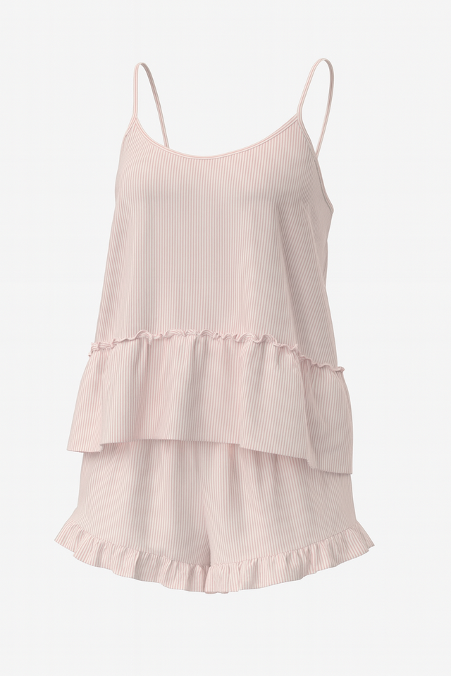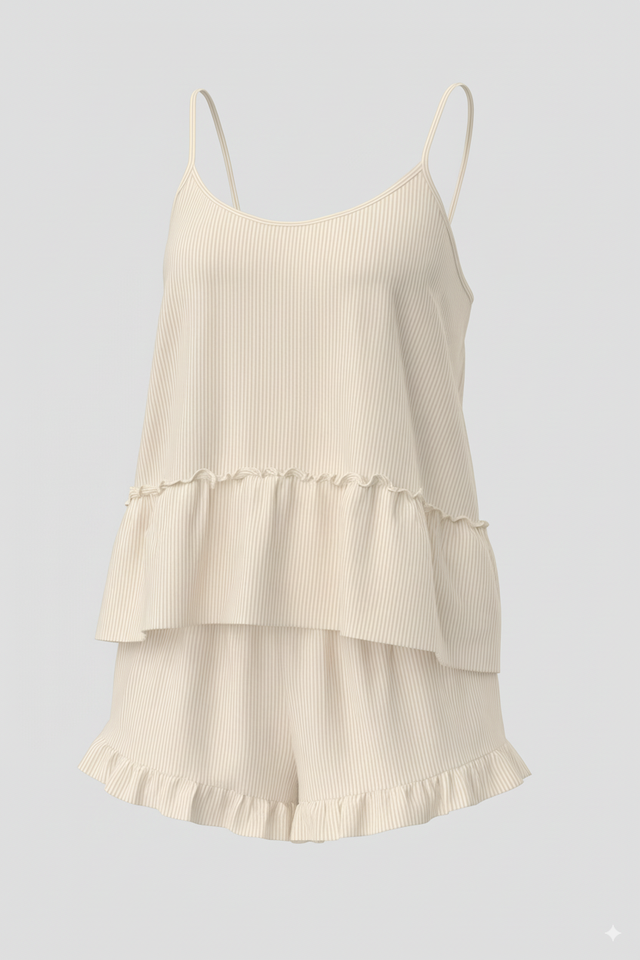 Ensemble de pyjama classique pour femmes, en tricot côtelé tissé, avec taille élastique et ourlet à volants, comprenant un haut de pyjama et un short, pour la détente et le sommeil, vente en gros