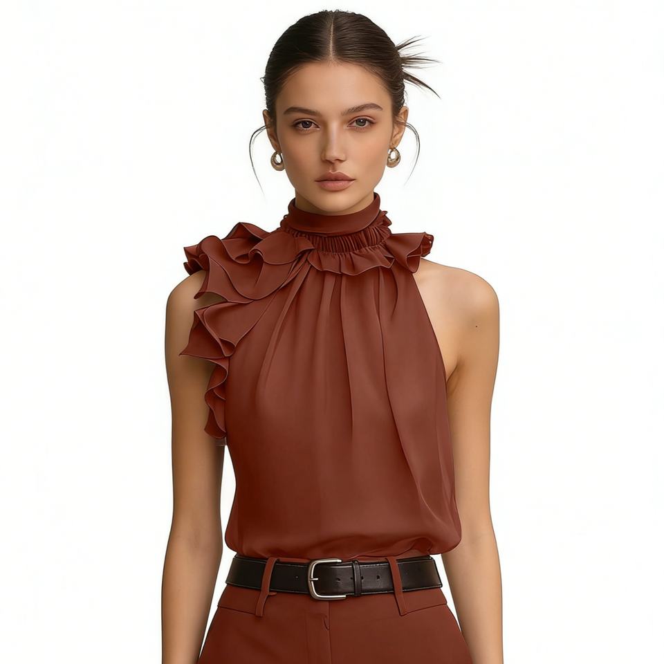 Chemisier en satin à col halter et volants pour femme - Haut sans manches à col montant avec bordure asymétrique à volants - Tendance mode
