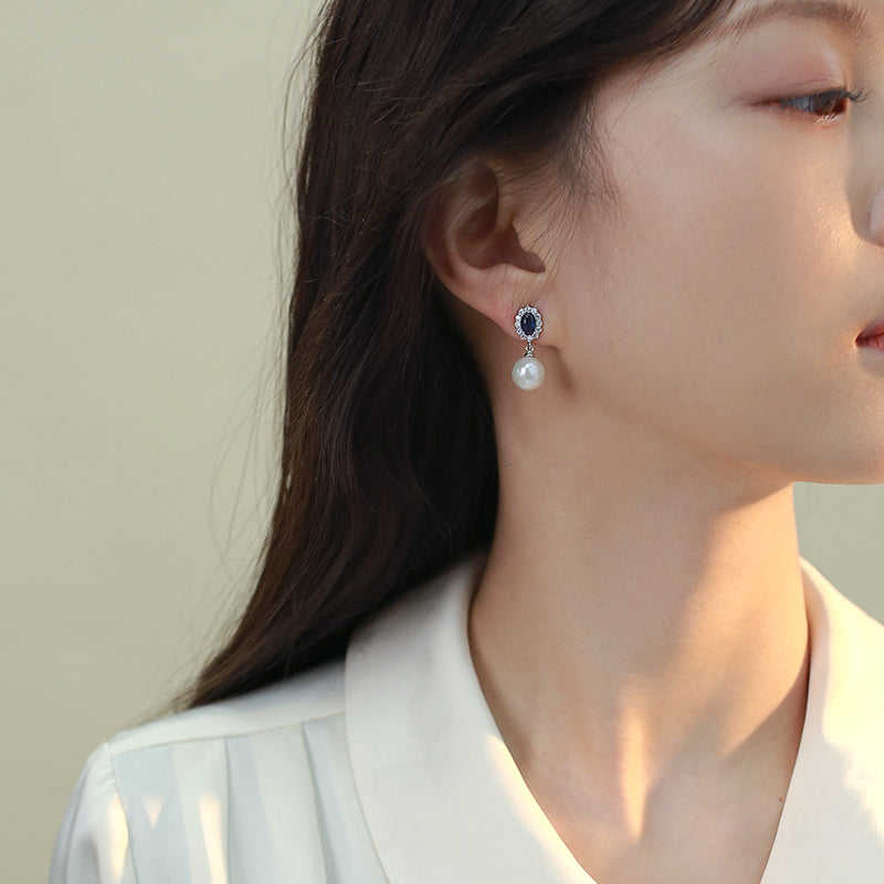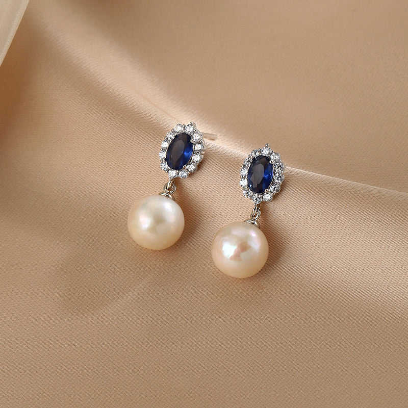 Women's S925 Silver Earrings with Blue Zircon and Natural Pearl Elegant Jewelry Accessory