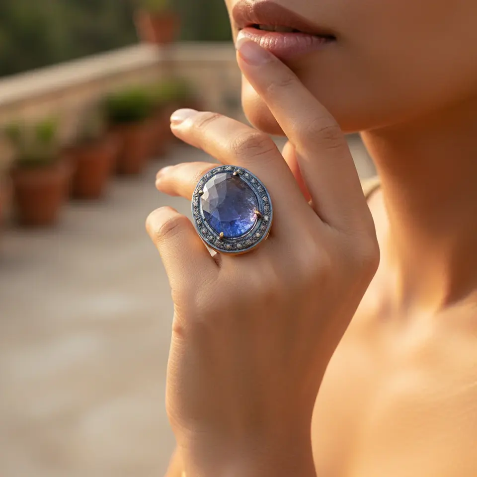 Women's Sapphire & Diamond Halo Ring Yellow Gold with Rhodium Plating Fine Jewelry Cut Stone Setting Inlay GRA Certificate
