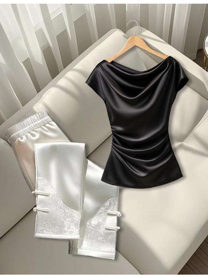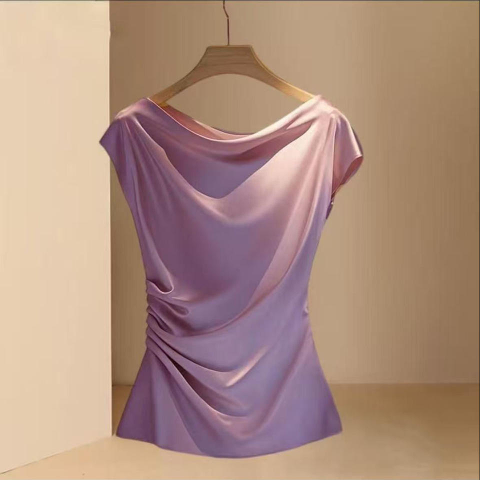 Haut en satin à col drapé et froncé pour femme - Blouse ajustée à manches courtes - Chemise tendance pour femme