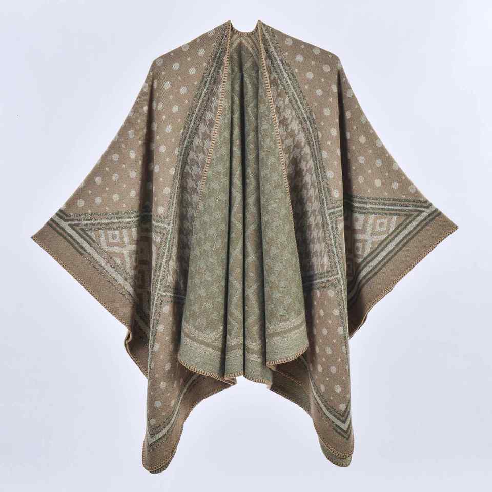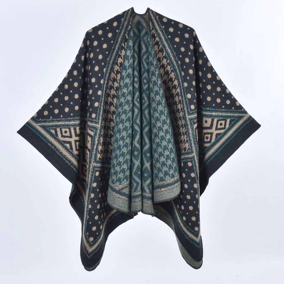 Women's Shawl Argyle Dot Color Stitching Thickened Warm Split Ethnic Style Outdoor Travel Cloak Reversible Lightweight