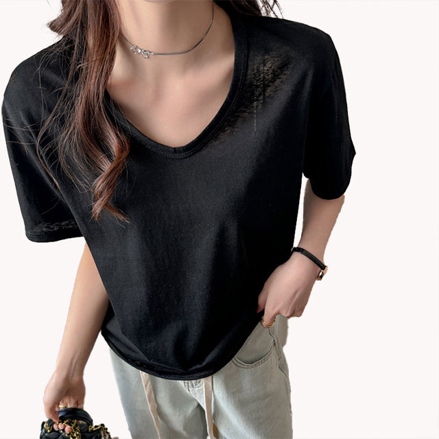 T-shirt à manches courtes en coton pour femme, col en V, épaules régulières, style décontracté, haut de gamme, polyvalent, couche de base