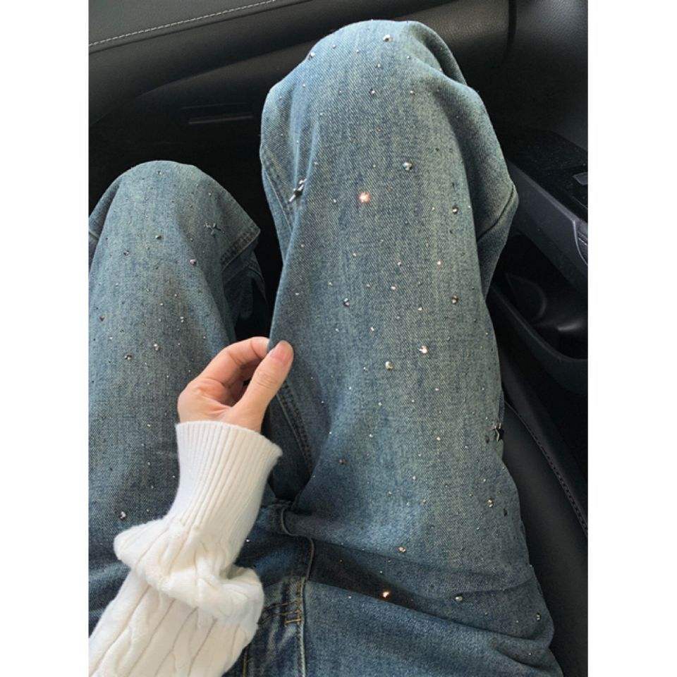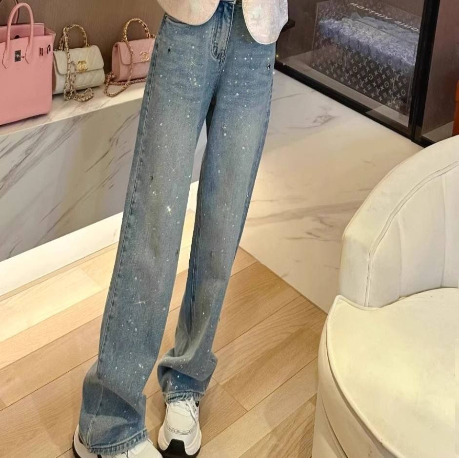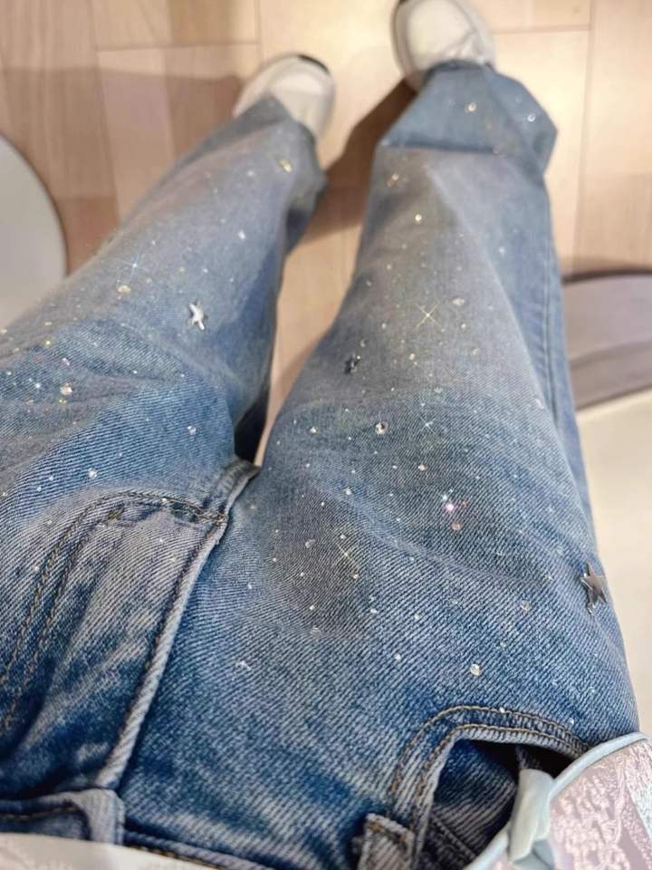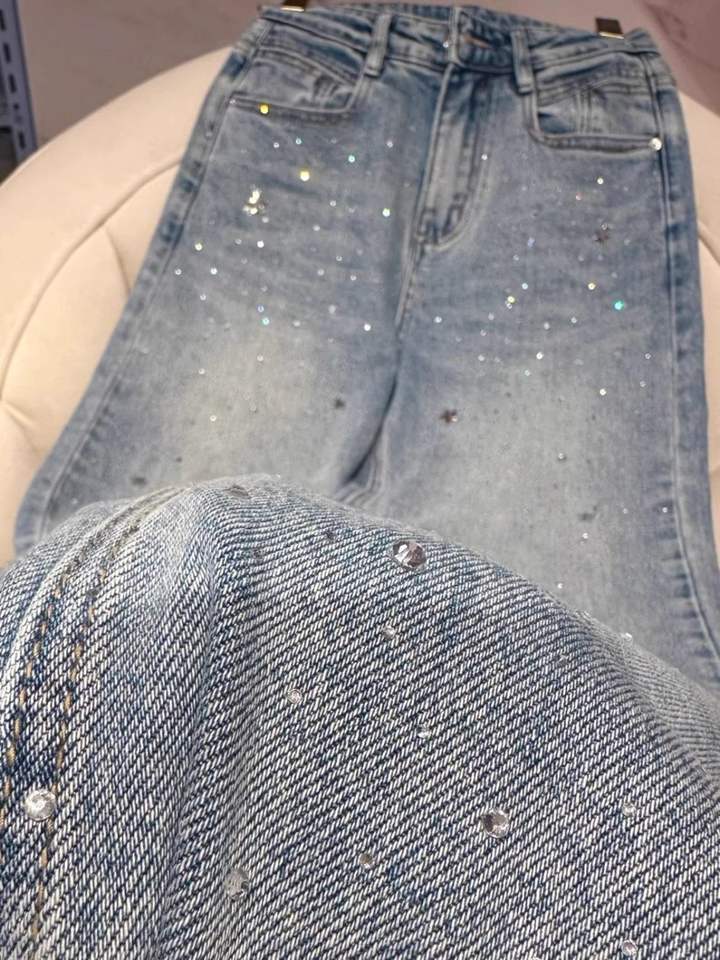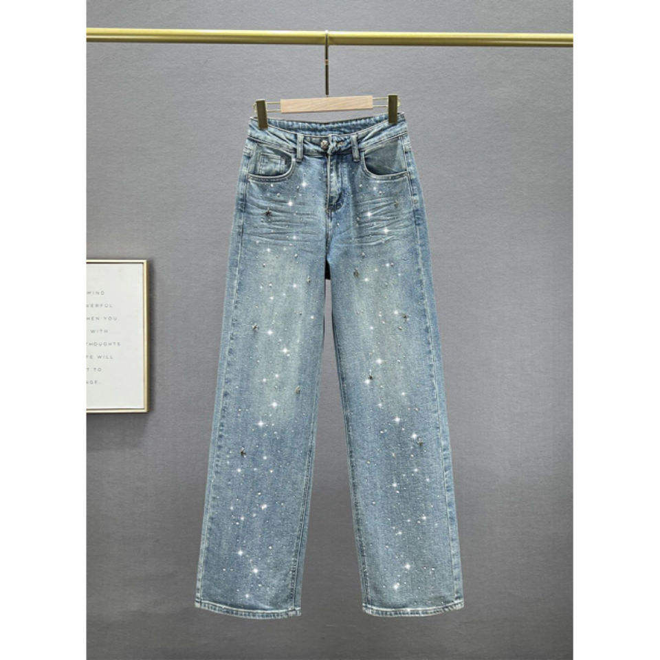 Jean large taille haute coupe droite orné de strass pour femme – Tendance
