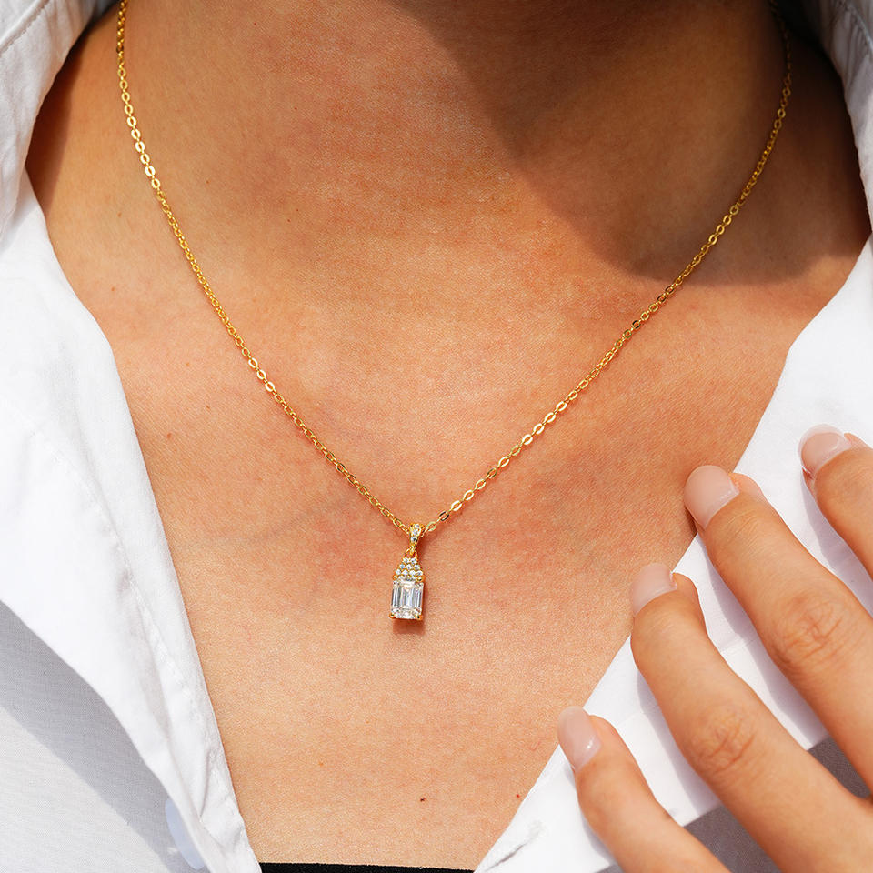 Women's Sterling Silver 925 Pendant 14K Gold Plated Rectangular Emerald with Full Moissanite Inlay