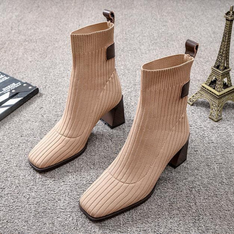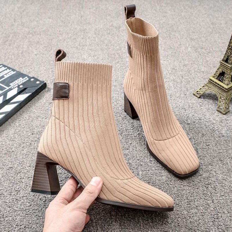 Women's Stylish Stretch Knit Chunky High Heel Sock Ankle Boots Lady Leather Autumn Chelsea Boots Fashionable Casual Shoes