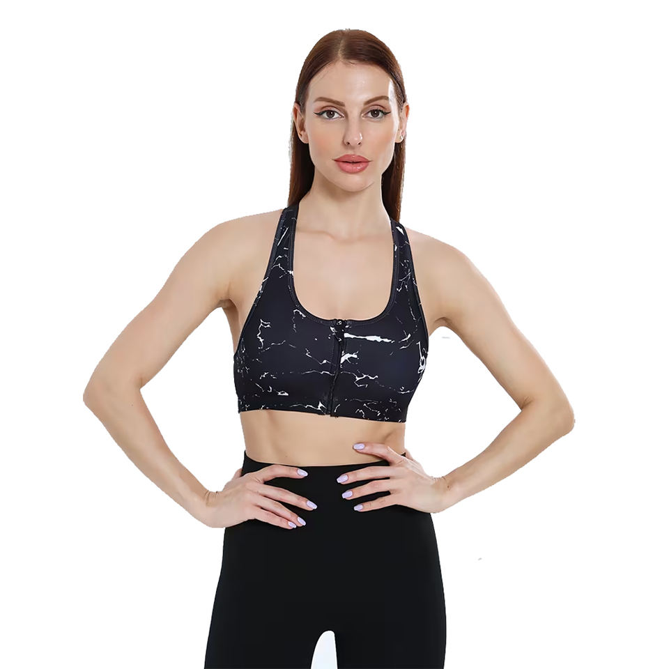 Soutien-gorge de sport respirant à sublimation pour femmes, simple, à maintien élevé, avec logo personnalisé, fermeture éclair sur le devant, pour le yoga et le fitness