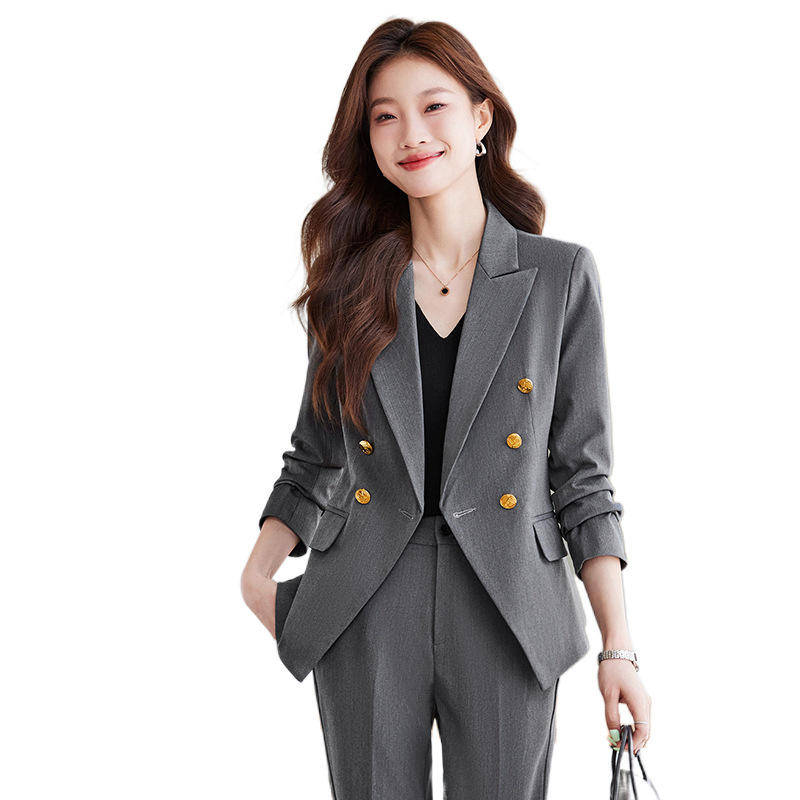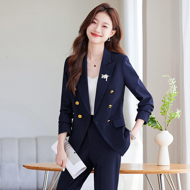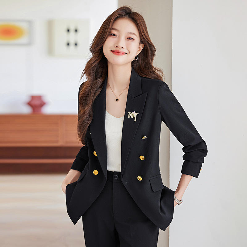Women's Suit Set Solid Color Polyester Anti-Wrinkle Double Breasted Work Uniform Professional Attire For Office Wear