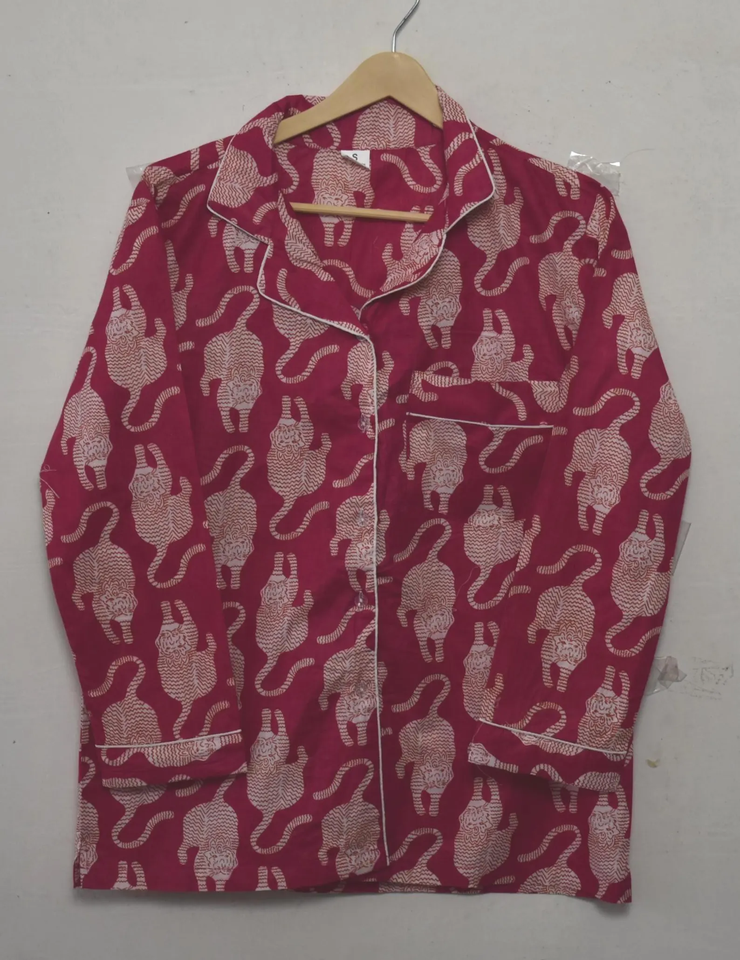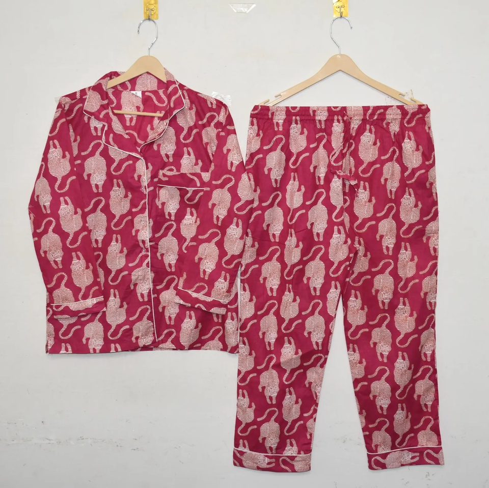 Ensemble pyjama en coton imprimé à la main pour femmes, été, deux pièces, respirant, séchage rapide, chemise boutonnée longue et pantalon de pyjama