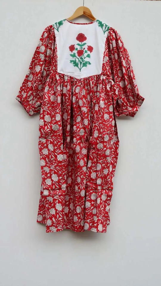 Women's Sustainable Floral Midi Dress Deep O-Neck with String Closer Washable Long Block Print Party-Style for Spring