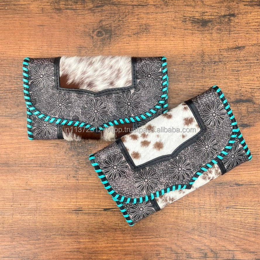 Portefeuille femme en cuir repoussé Turquoise lacé véritable cuir de vachette point à la main portefeuille en cuir Western Hair On Hide portefeuille de carte de crédit