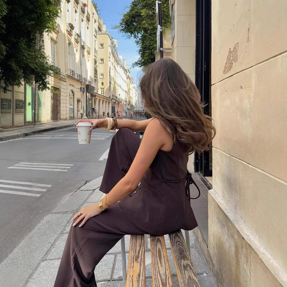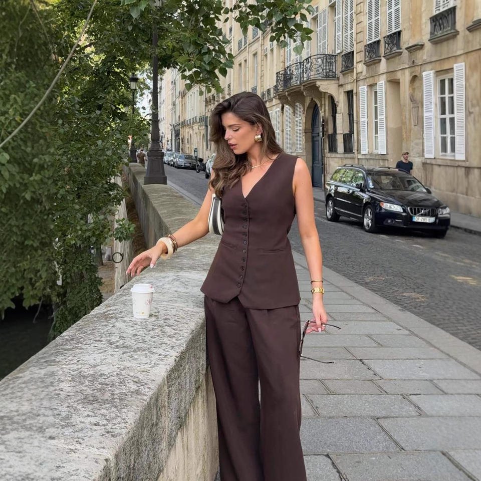 Ensemble deux pièces pour femmes pour le printemps et l'été, style décontracté, haut sans manches avec bretelles et pantalon large à pattes d'éléphant