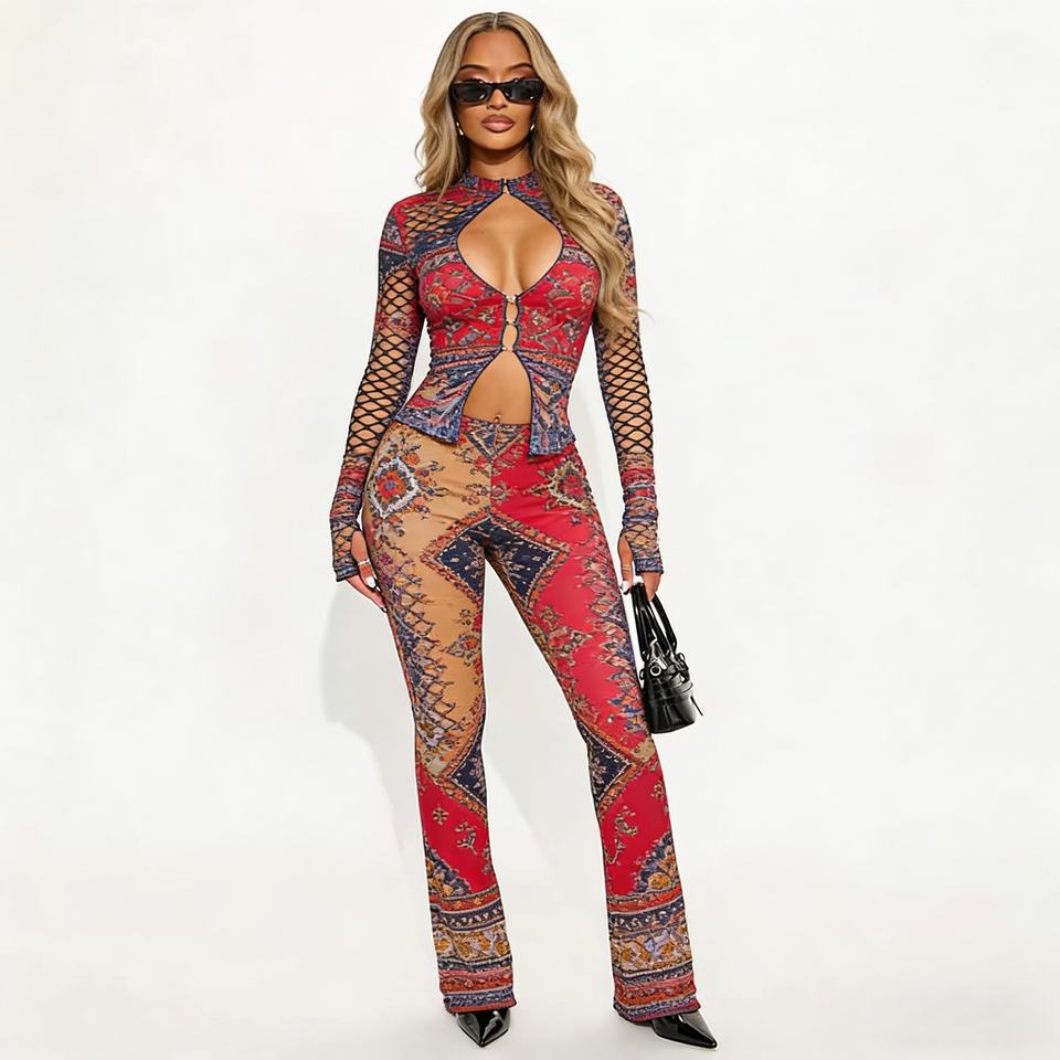 Ensemble deux pièces en velours pour femme, haut court à manches longues en jacquard rose et pantalon évasé assorti, élégant, sexy, pour soirée, tenue de soirée personnalisée