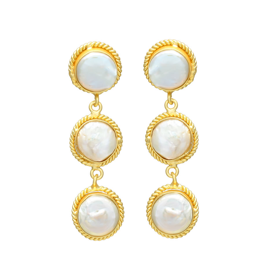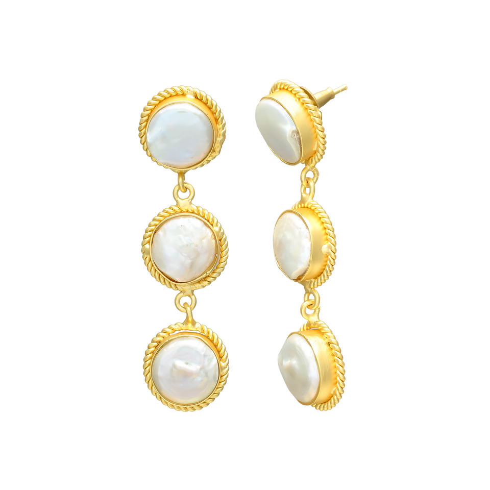 Women's Vintage Ethnic 3-Tier Stud Earrings Natural Freshwater Coin Pearls Twisted Brass Wire 24K Gold Plated Nickel Free